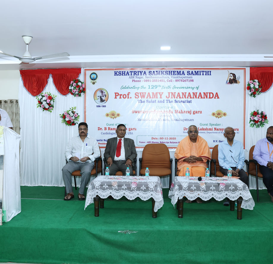 విశాఖపట్నం క్షత్రియ సంక్షేమ సమితి వారు 05-12-2025వ తేదీ సాయంత్రం 4.00 గంటలకు ASR భవన్ సెకండ్ ఫ్లోర్ లో స్వామి జ్ఞానానంద వారి 129 వ జయంతి సమావేశాన్ని ఘనంగా నిర్వహించడం జరిగింది. ఈ సమావేశంలో మొదటగా సెక్రటరీ శ్రీ R.V. గణపతి రాజు గారు ఉపాధ్యక్షులు శ్రీ S.S.N. రాజు గారిని, చైర్మన్ శ్రీ G.S.N. రాజు గారిని ఈ కార్యక్రమానికి ముఖ్య అతిధిగా విచ్చేసిన విశాఖపట్నం రామకృష్ణ మిషన్ సెక్రటరీ శ్రీ స్వాసం వేద్యానంద మహారాజ్ గారిని, గౌరవ అతిధి కార్డియోలజిస్ట్ ఫ్లోరిడా, USA డా. బి. రామరాజు గారిని, గెస్ట్ స్పీకర్ AU న్యూక్లియర్ ఫిజిక్స్ డిపార్ట్మెంట్ హెడ్ డా. పి. వి లక్ష్మీనారాయణ గారిని వేదిక మీదకు సాదరంగా ఆహ్వానించారు. అనంతరం జ్యోతి ప్రజ్వలన చేసి స్వామి జ్ఞానానంద వారి చిత్రపటానికి పూవులు సమర్పించి ప్రార్థనా గీతం ఆలపించి సభను ప్రారంబించడం జరిగింది. సమితి ఉపాధ్యక్షులు శ్రీ S.S.N. రాజు గారు సమావేశానికి విచ్చేసిన అతిధులకు సభ్యులందరకు స్వాగతం తెలియ జేశారు. స్వామి జ్ఞానానంద గారి జీవితం గురించి వారు చేసిన సేవల గురించి, సాధించిన విజయాల గురించి తేదీలతో సహా వివరంగా తెలియజేయడం జరిగింది. తర్వాత చైర్మన్ శ్రీ G.S.N. రాజు గారు మాట్లాడుతూ చాల మంది మేధావుల జీవితంలో సైన్టిస్టులు అయిన తర్వాత సన్యాసులుగా మారతారు. కానీ స్వామిజి వారు ముందు సన్యాసిగా మారి తర్వాత గొప్ప సైన్టిస్ట్ గా అయ్యారు. ఆయన జర్మనీ వెళ్లి వేదిక్ ఫిలాసఫీ లిటరేచర్ మీద బాగా పని చేసారు. న్యూక్లియర్ ఫిజిక్స్ మీద రీసెర్చ్ చేసారు. ఈ రోజులలో సైన్స్ గురించి మీనింగ్ తెలియకుండానే సైన్టిస్ట్ లు అవుతున్నారు. సిస్టమాటిక్ కంప్రెహెన్సీవ్, ఇన్వెస్టిగేషన్, ఎంప్లోరేషన్, నేచురల్ కాసెస్, ఎఫెక్ట్స్(సైన్స్) అని విద్యార్థులకు వివరించడం జరిగింది. మాజీ చైర్మన్ శ్రీ M.S.N. రాజు గారు మాట్లాడుతూ స్వామి జ్ఞానానంద గారికి వివాహం అయినప్పటికీ వైవాహిక జీవితం మీద ఇంట్రెస్ట్ లేక ఆయనకున్న ఆధ్యాత్మిక చింతనతో చిన్న వయసులోనే హిమాలయాలకు వెళ్లి కఠోర సాధన చేసి ఆత్మ సాక్షాత్కారం పొందారు. ఇంకా ఆధ్యాత్మిక విషయాల గురించి, అయన సైన్టిస్ట్ గా సాధించిన విజయాల గురించి వివరించారు. గెస్ట్ స్పీకర్ డా. P.V. లక్ష్మీనారాయణ గారు మాట్లాడుతూ స్వామిజీ గారి గురించి ఎంత చెప్పిన తనివి తీరదు. న్యూక్లియర్ ఫిజిక్స్ డిపార్ట్ మెంట్ కి హెడ్ గా ఉండడం నా అదృష్టం అని అన్నారు. ఆత్మ సాక్షాత్కారం పొందిన వాళ్ళకి దేనిమీదా వ్యామోహం ఉండదు కానీ ఆయనకి చిన్నప్పటినుండి సైన్స్ మీద ఉన్న ఆసక్తి వలన అయన జర్మనీ వెళ్లి రీసెర్చ్ చేయడం చాల గొప్ప విషయం అని అన్నారు. స్వామిజీ చరిత్ర ఎప్పుడూ మనకు ఇన్స్పిరేషన్ అని అన్నారు. తర్వాత ముఖ్య అతిధి స్వాసంవేద్యానంద మహారాజ్ గారు స్వామిజీ గురించి వివరించార